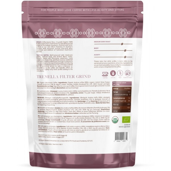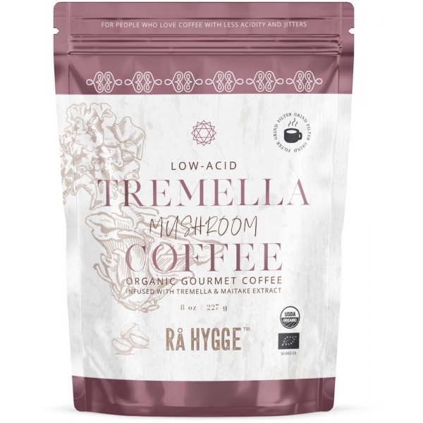 Low-acid mushroom coffee blend with tremella and maitake extract infused in Peruvian coffee beans from small farmer co-operatives.