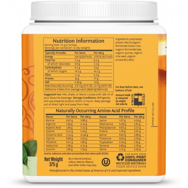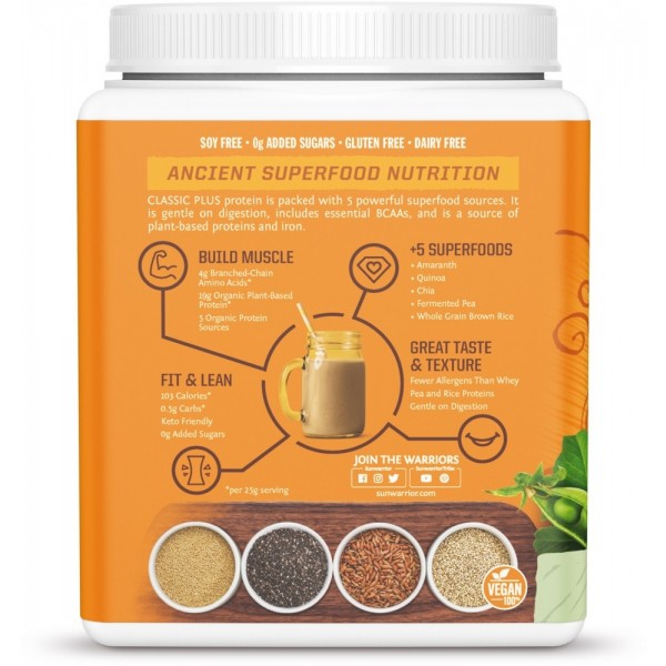 Classic Plus contains 5 plant-based protein sources including the ancient grains quinoa and amaranth plus fermented pea, whole grain brown rice and chia seed. This nutrient-dense protein supplies all the essential amino acids and delivers 19g organic plant-based protein including 4g of BCAA, with no added sweeteners or sugars.