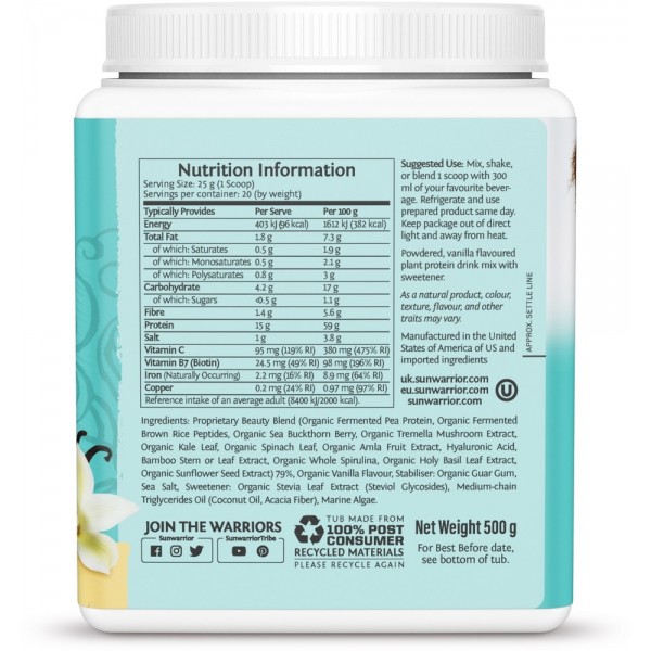 Proprietary Beauty Blend (Organic Fermented Pea Protein, Organic Fermented Brown Rice Peptides, Organic Sea Buckthorn Berry, Organic Tremella Mushroom Extract, Organic Kale Leaf, Organic Spinach Leaf, Organic Amla Fruit Extract, Hyaluronic Acid, Bamboo Stem or Leaf Extract, Organic Whole Spirulina, Organic Holy Basil Leaf Extract, Organic Sunflower Seed Extract) 79%, Organic Vanilla Flavour, Stabiliser: Organic Guar Gum, Sea Salt, Sweetener: Organic Stevia Leaf Extract (Steviol Glycosides), Medium-chain Triglycerides Oil (Coconut Oil, Acacia Fibre), Marine Algae.