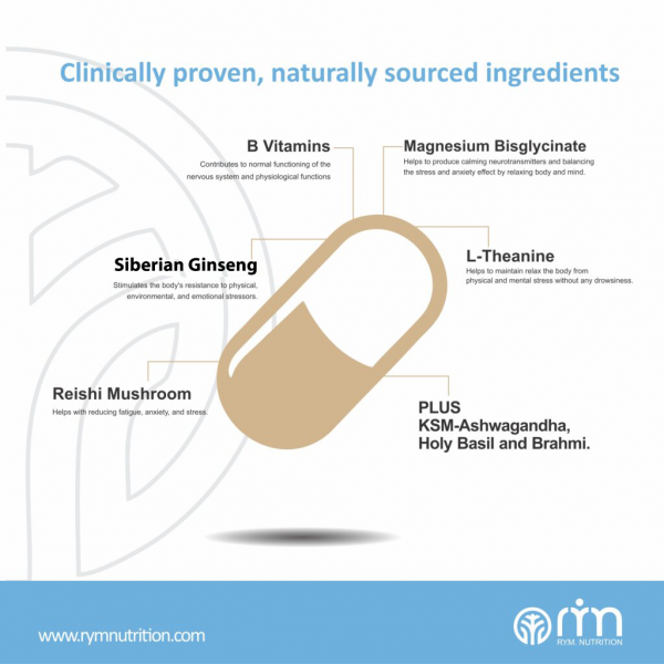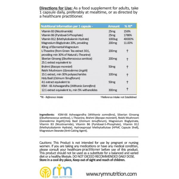 KSM-66 Ashwagandha (Withania somnifera), Siberian Ginseng (Eleutherococcus senticosus), L-Theanine, Brahmi (Bacopa monnieri), Reishi Mushroom (Ganoderma lingzhi),Holy Basil (Ocimum tenuiflorum), Magnesium Bisglycinate, Vitamin B3 (Nicotinamide), Vitamin B6 (Pyridoxal-5-Phosphate), Vitamin B12 (Methylcobalamin Hydrate), Hydroxypropyl Methylcellulose (HPMC Capsule Shell), Magnesium Stearate (Anti-Caking Agent).