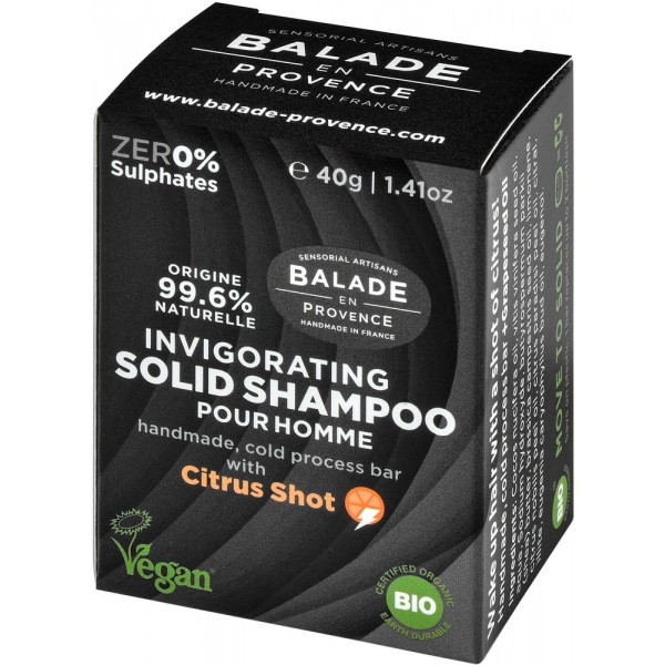 Wake up your hair with this citrus-infused, certified organic solid shampoo enriched with coconut oil, grape seed oil, canola oil and shea butter. This sulfate-free solid shampoo is 99.6% natural and specially formulated for men to moisturize the scalp and leave hair stronger and shinier.