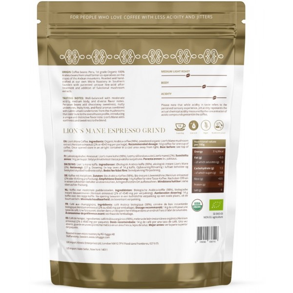 Low-acid lion's mane mushroom coffee with lion's mane extract infused in Peruvian coffee beans from small farmer co-operatives.