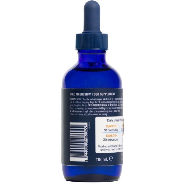Suggested use: Using the metered dropper, take 1-3.6ml (1-4 droppers) daily. Days 1-3: 10 drops/day. Days 4-6: 10 additional drops/day. Days 7+: 10 additional drops every few days until you reach 80 drops (3.6ml) spread throughout the day. THIS PRODUCT HAS A VERY STRONG, SALTY FLAVOUR. We don’t add any flavours or sweeteners, so we recommend adding it to your favourite flavoured drinks to mask the taste. Do not refrigerate. A high intake of magnesium may cause a laxative effect. If this occurs, simply reduce the amount per serving.