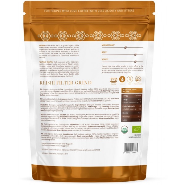 The medium-roasted coffee contains double-extracted (30% polysaccharide content) organic reishi (Ganoderma lucidum), which adds an earthy umami taste. The coffee beans come from small-farmer co-operatives in the Andean mountain slopes of Peru and the mushrooms are cultivated with long history of Traditional Chinese Medicine in the region of