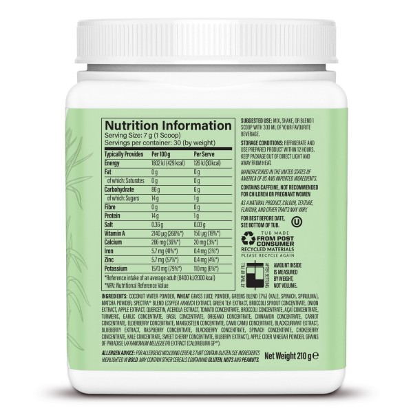 COCONUT WATER POWDER, WHEAT GRASS JUICE POWDER, GREENS BLEND (7%) (KALE, SPINACH, SPIRULINA), MATCHA POWDER, SPECTRA BLEND (COFFEA ARABICA EXTRACT, GREEN TEA EXTRACT, BROCCOLI SPROUT CONCENTRATE, ONION EXTRACT, APPLE EXTRACT, QUERCETIN, ACEROLA EXTRACT, TOMATO CONCENTRATE, BROCCOLI CONCENTRATE, AÇAÍ CONCENTRATE, TURMERIC, GARLIC CONCENTRATE, BASIL CONCENTRATE, OREGANO CONCENTRATE, CINNAMON CONCENTRATE, CARROT CONCENTRATE, ELDERBERRY CONCENTRATE, MANGOSTEEN CONCENTRATE, CAMU CAMU CONCENTRATE, BLACKCURRANT EXTRACT, BLUEBERRY EXTRACT, RASPBERRY CONCENTRATE, BLACKBERRY CONCENTRATE, SPINACH CONCENTRATE, CHOKEBERRY CONCENTRATE, KALE CONCENTRATE, SWEET CHERRY CONCENTRATE, BILBERRY EXTRACT), APPLE CIDER VINEGAR POWDER, GRAINS OF PARADISE (AFRAMOMUM MELEGUETA) EXTRACT (CALORIBURN GP®).