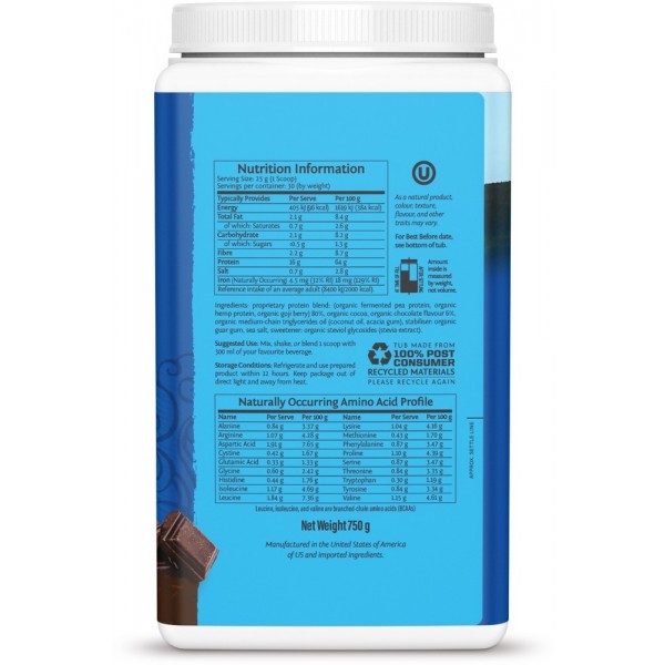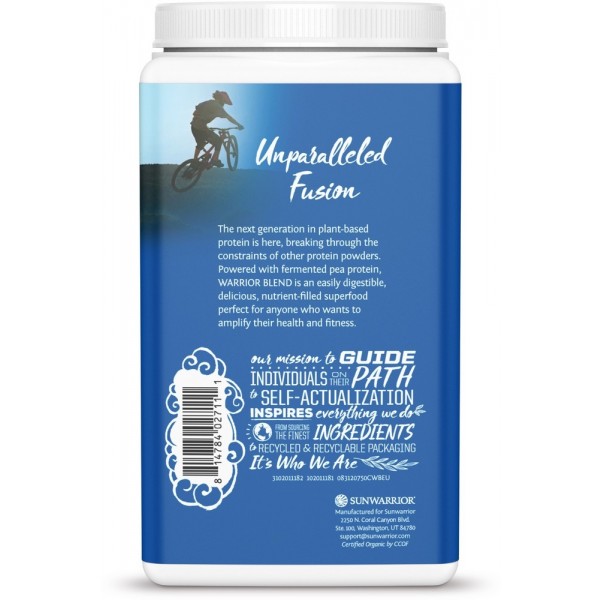 SunWarrior’s Warrior Blend (Chocolate) fuses the synergistic power of several rich protein sources into a one smooth, great-tasting plant-based blend. Fermented yellow peas, goji berries and hemp seeds come together to supply a complete amino acid profile with a substantial amount of BCAAs (branch-chain amino acids). Enhanced with coconut MCTs (medium-chain triglycerides) to fuel your body and active lifestyle. Warrior Blend is a high-performance plant-based protein blend, designed for anyone who wants to amplify their health and fitness.
