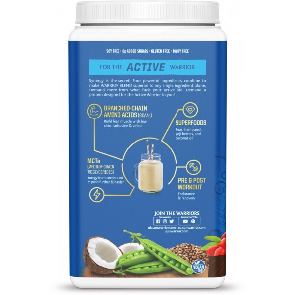 Warrior Blend Chocolate contains a synergy of four powerful ingredients designed to fuel your active life. Organic fermented pea protein with organic hemp seed and organic goji berry supplies a robust amino acid profile delivering 16g of plant-based, vegan protein including 4g BCAAs per serving. Enriched with organic coconut medium-chain triglycerides (MCTs), Warrior Blend is designed for the ACTIVE Warrior in you and is ideal pre-and/or post-workout.