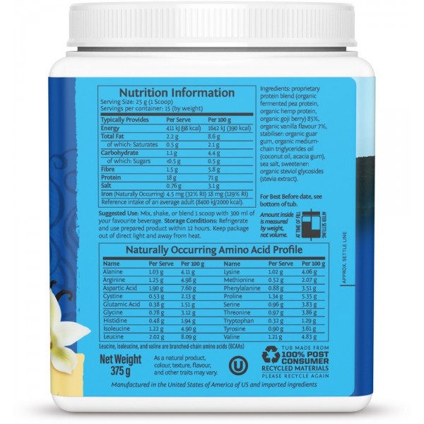 Proprietary Protein Blend (Organic Fermented Pea Protein, Organic Hemp Protein, Organic Goji Berry) 85%, Organic Vanilla Flavour 7%, Stabiliser: Organic Guar Gum, Organic Medium-Chain Triglycerides Oil (Coconut Oil, Acacia Gum), Sea Salt, Sweetener: Organic Steviol Glycosides (Stevia Extract).